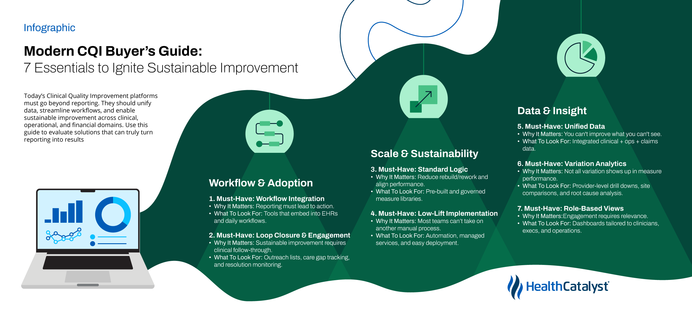 The Clinical Quality Improvement Playbook and Modern CQI Buyer’s Guide identify seven essentials defining a modern CQI platform. For ambulatory and clinical operations leaders, these three are mission-critical to improving performance across sites and service lines.