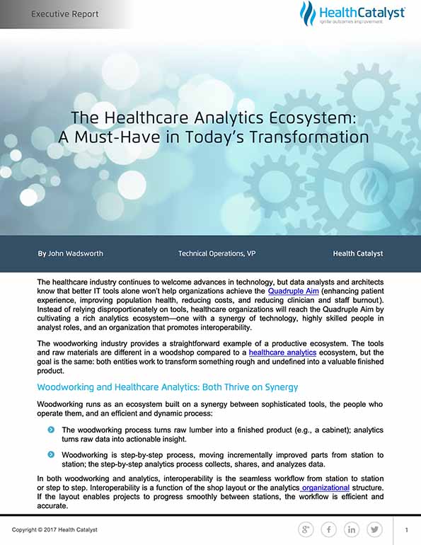Healthcare organizations seeking to achieve the Quadruple Aim (enhancing patient experience, improving population health, reducing costs, and reducing clinician and staff burnout), will reach their goals by building a rich analytics ecosystem. This environment promotes synergy between technology and highly skilled analysts and relies on full interoperability, allowing people to derive the right knowledge to transform healthcare.