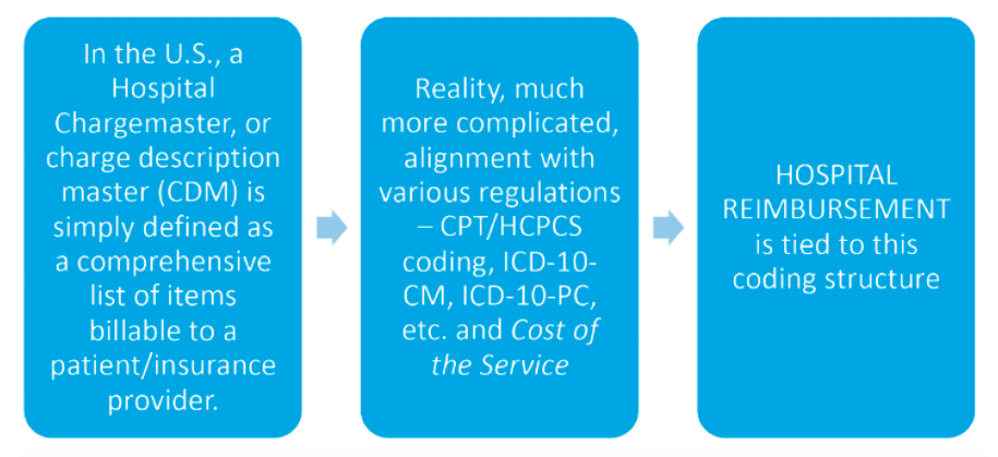 Due to U.S. reimbursement regulations (CPT coding, HCPCS coding, ICD-10 procedure coding, and the common diagnosis procedures), the chargemaster is a complicated listing, making transparent healthcare pricing more challenging. Structuring the chargemaster in alliance with coding regulations is so involved that the billing department sometimes loses that individual item's cost.