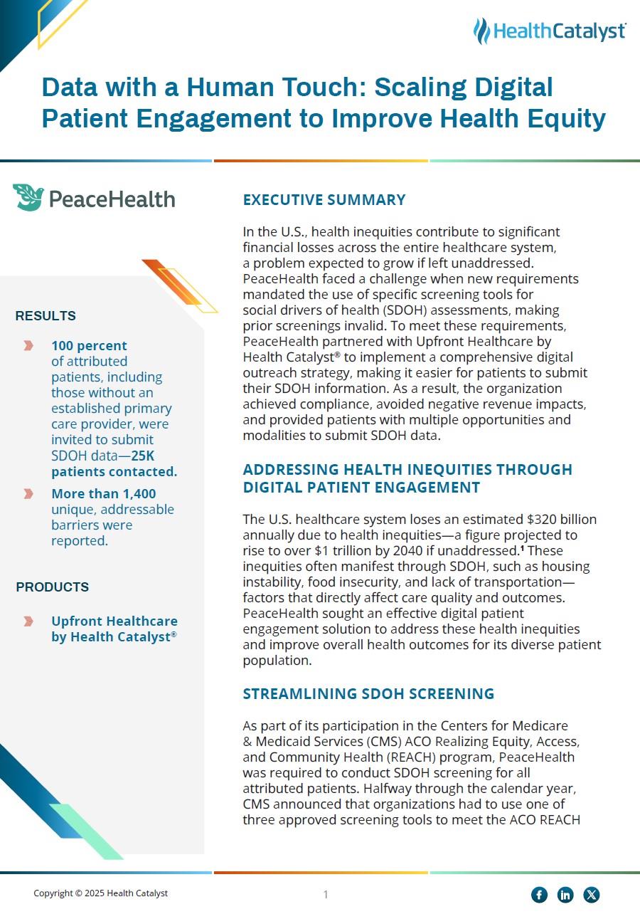 In the U.S., health inequities contribute to significant financial losses across the entire healthcare system, a problem expected to grow if left unaddressed. PeaceHealth faced a challenge when new requirements mandated the use of specific screening tools for social drivers of health (SDOH) assessments, making prior screenings invalid. To meet these requirements, PeaceHealth partnered with Upfront Healthcare by Health Catalyst® to implement a comprehensive digital outreach strategy, making it easier for patients to submit their SDOH information. As a result, the organization achieved compliance, avoided negative revenue impacts, and provided patients with multiple opportunities and modalities to submit SDOH data.