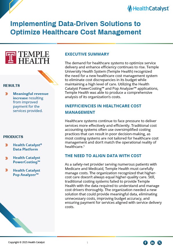 The demand for healthcare systems to optimize service delivery and enhance efficiency continues to rise. Temple University Health System (Temple Health) recognized the need for a new healthcare cost management system to eliminate cost discrepancies in its budget while maintaining a high level of care. Utilizing the Health Catalyst PowerCosting™ and Pop Analyzer™ applications, Temple Health was able to produce a comprehensive analysis of its organization’s costs.