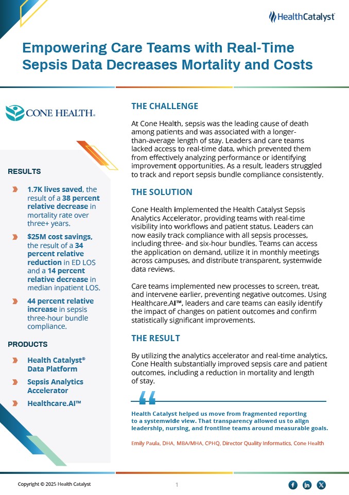 Cone Health faced challenges with sepsis care, which was the leading cause of patient mortality and contributed to longer hospital stays. To address this, the organization implemented the Health Catalyst Sepsis Analytics Accelerator, providing care teams with real-time data on patient status and workflow compliance. This enhanced visibility enabled leaders to track performance, identify improvement opportunities, and help teams screen, treat, and intervene sooner, resulting in better sepsis care and improved patient outcomes.