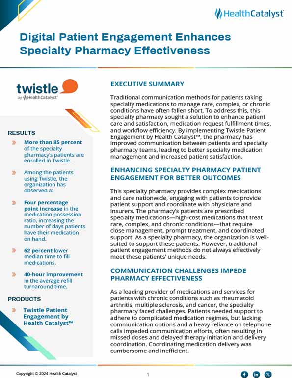 Traditional communication methods for patients taking specialty medications to manage rare, complex, or chronic conditions have often fallen short. To address this, this specialty pharmacy sought a solution to enhance patient care and satisfaction, medication request fulfillment times, and workflow efficiency. By implementing Twistle Patient Engagement by Health Catalyst™, the pharmacy has improved communication between patients and specialty pharmacy teams, leading to better specialty medication management and increased patient satisfaction.