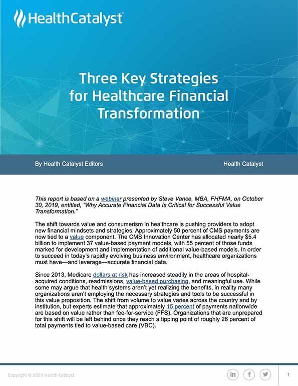 As the healthcare industry moves further into pay for value, organizations need to shift their strategy and mindset to deliver the best care at the lowest costs. Accurate financial data is critical for any successful value transformation and enables strategic decision making and goal alignment across the organization. Health systems must invest the time and resources to obtain and leverage the data needed for sustained transformation. Organizations must also have a clear long-term vision for financial viability that includes a path to providing high-quality, affordable healthcare. A robust analytics platform combined with operational, organizational, and financial strategies translates to sustained success in the world of VBC.