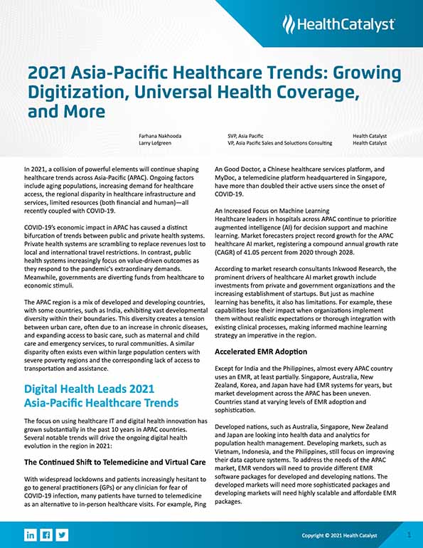 Along with the rest of the globe, 2021 healthcare trends across Asia-Pacific (APAC) countries will center on COVID-19 recovery and resuming the healthcare improvement journey. In the APAC region, however, a mix of developed and developing countries poses unique challenges, as healthcare access and basic infrastructure vary widely between urban and rural populations and economic levels. To shepherd healthcare out of the pandemic and enhance delivery overall in 2021, APAC nations will focus on increasing investment in digital health (including virtual care, machine learning, and EMR adoption), achieving universal health coverage, shifting more towards value, and improving payer-provider relationships.