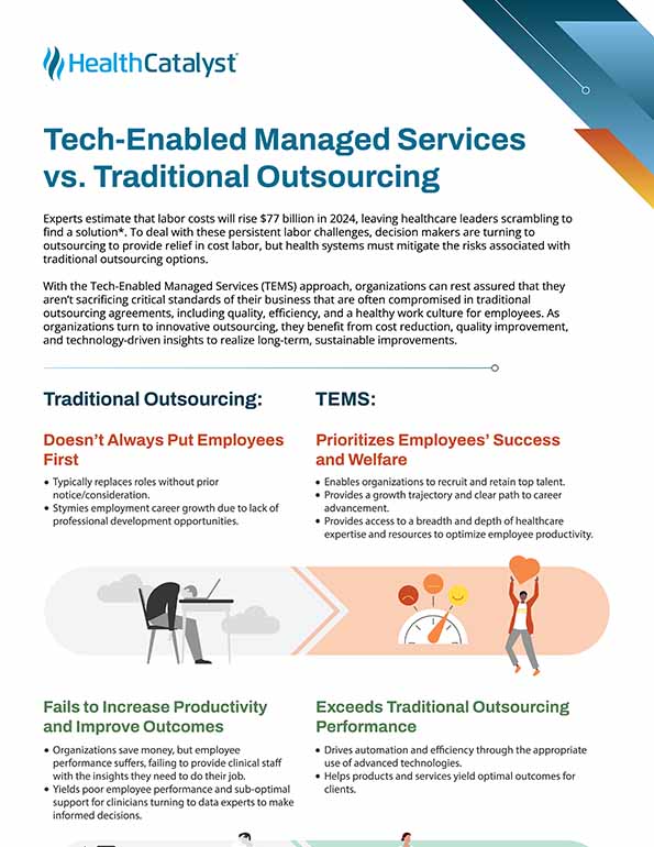 Through Tech-Enabled Managed Services (TEMS) by Health Catalyst, clients alleviate financial pressures through a guaranteed pathway to cost savings. To rescue hospitals from their financial struggles, outsourcing strategies must also mitigate quality risks associated with traditional workforce reductions.