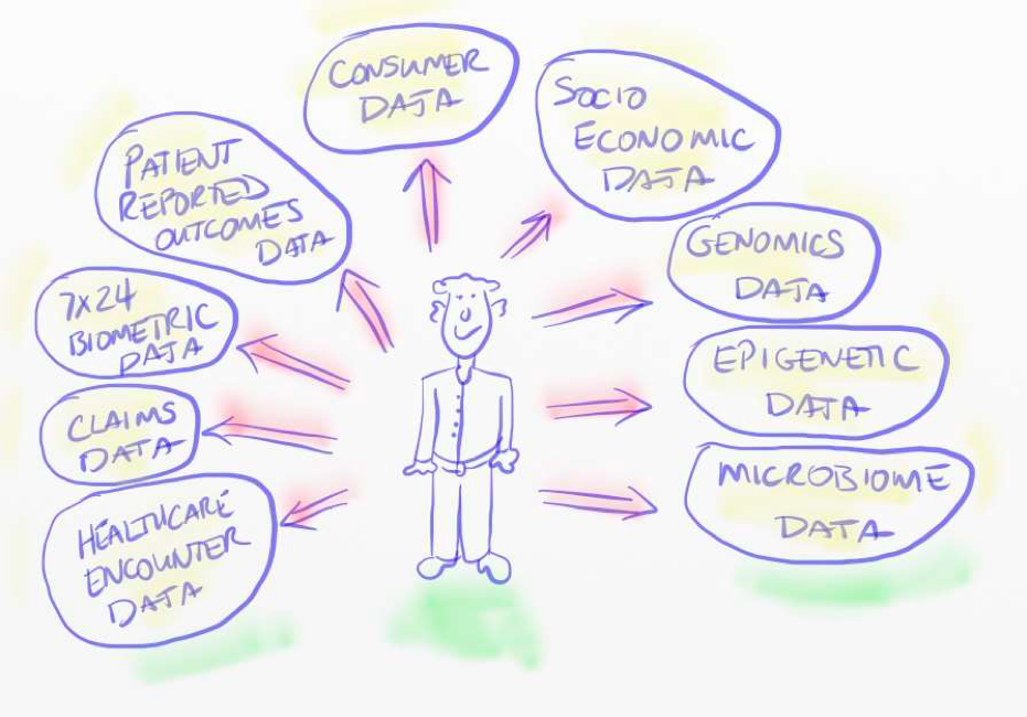 Figure 1 shows a recommendation for a data assets roadmap for healthcare to guide data acquisition and data government strategies to truly understand the patient at the center of healthcare. Much of healthcare is stuck in the lower left quadrant of this diagram (healthcare encounter and claims data).