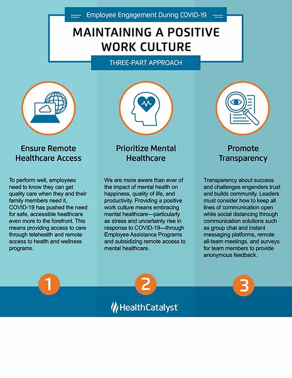 Healthcare team members who may have transitioned to the remote setting during the pandemic include case managers, clinicians offering telehealth services, as well as administrative, financial, and IT teams, and others contributing away from the frontlines of care. As health system leaders and managers consider when, if, and how these individuals might return to the office setting, positive work culture can be a consistent and unifying factor, giving organizations a constant source of guidance and community in an unpredictable landscape.