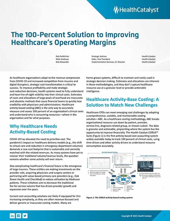 Healthcare CFOs can meet emerging cost challenges by adopting a comprehensive, scalable, and maintainable costing solution—ABC. As a healthcare costing methodology, ABC breaks organizational resource use down by patient, provider, service-line, diagnosis-related group, or chosen subset. The data is granular and actionable, pinpointing where the system has the opportunity to improve financially. The Health Catalyst PowerCosting™ is the first activity-based cost accounting system widely available today to track 100 percent of clinical costs, using time-driven and other activity drivers to understand resource consumption accurately.