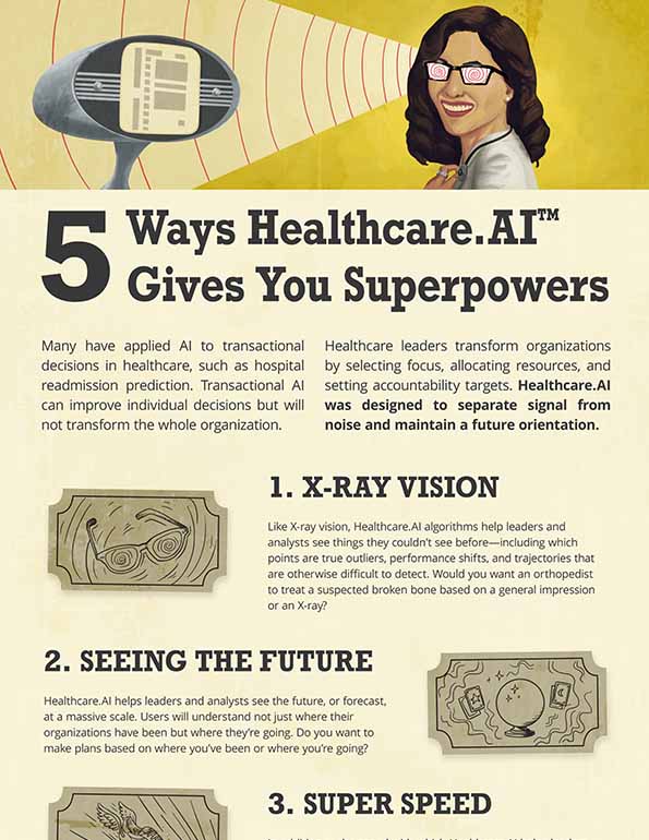 With Healthcare.AI™, five super-powered assistive augmented intelligence capabilities help healthcare leaders and analysts determine values, understand context, and provide data-driven motivation to transform healthcare: