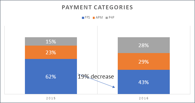 The risk and reimbursement structure in healthcare adds to the cost burden. The American Hospital Association reports that health plans and systems are slow to pursue capitated payment plans. As shown in Figure 1, only 29 percent of medical payments were linked to alternative payment models (APMs) in 2016 (e.g., shared savings, shared risk, bundled payments, or population-based payments). Payers often reimburse on a fee-for-service (FFS) basis (43 percent of healthcare dollars in 2016), but put providers at risk for various measures, setting up a greater risk component than has ever existed. For example, payers compare competing hospitals on utilization and reward the better performers; It is in their interest to reduce utilization, thereby reducing claims.