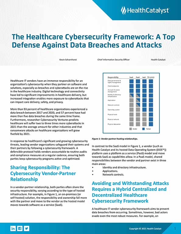 In response to healthcare’s significant and growing cybersecurity threats, leading vendor organizations safeguard their systems and their partners by following a cybersecurity framework. A defensible protocol holds vendors accountable to routine audits and compliance measures at a regular cadence, ensuring both parties keep cybersecurity programs active and optimized.