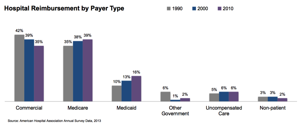 The first hospital challenge, shifting revenue mix, is demonstrated in the graph below. The percentage of commercial payers will continue to shrink, while payer types with lower reimbursement rates will increase.