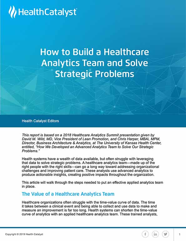Health systems have a wealth of data available, but often struggle with leveraging that data to solve strategic problems. A healthcare analytics team—made up of the right people with the right skills—can go a long way toward addressing organizational challenges and improving patient care. These analysts use advanced analytics to produce actionable insights, creating positive impacts throughout the organization.