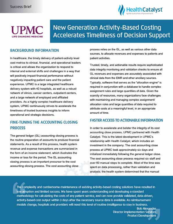 After exploring the options to enhance and commercialize its cost management intellectual property, UPMC partnered with Health Catalyst to use the Health Catalyst® Data Operating System (DOS™) to co-develop and commercialize the PowerCosting™ application.