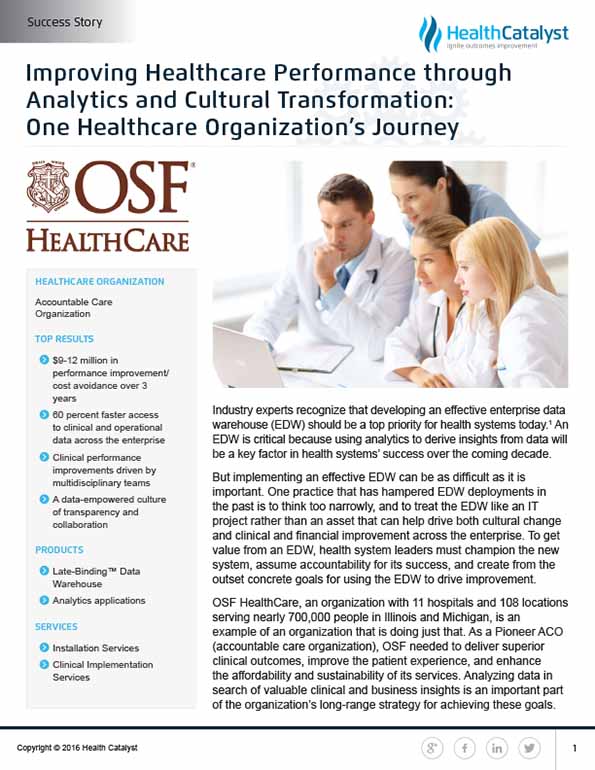 OSF’s successful solution to these challenges began with the implementation of a late-binding EDW from Health Catalyst. This EDW aggregates clinical, claims, financial, and other data to create a consistent view of the ACO’s data—a single source of truth to inform decisions. The EDW served as an important foundation of useful, timely, and accessible information for stakeholders throughout the organization to guide improvement efforts.