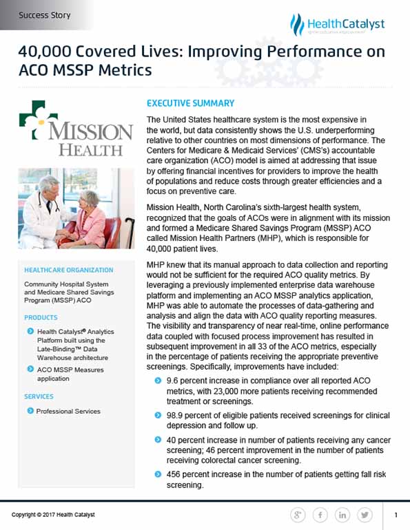 Providing Access and Visibility to ACO Metrics Performance Data Mission had previously implemented an enterprise data warehouse platform (EDW) from Health Catalyst that aggregates clinical, financial, operational, and other data sources. The EDW served as the basis for automating the previously manual processes of data gathering and report creation for ACO metrics, with the addition of the ACO MSSP Measure analytics application (see Figure 1).