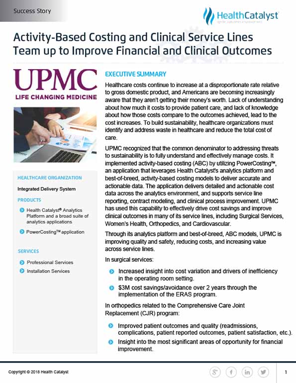 UPMC recognized that the common denominator to addressing threats to sustainability is to fully understand and effectively manage costs. It implemented activity-based costing (ABC) by utilizing PowerCosting™, an application that leverages Health Catalyst's analytics platform and best-of-breed, activity-based costing models to deliver accurate and actionable data. The application delivers detailed and actionable cost data across the analytics environment, and supports service line reporting, contract modeling, and clinical process improvement. UPMC has used this capability to effectively drive cost savings and improve clinical outcomes in many of its service lines, including Surgical Services, Women’s Health, Orthopedics, and Cardiovascular.