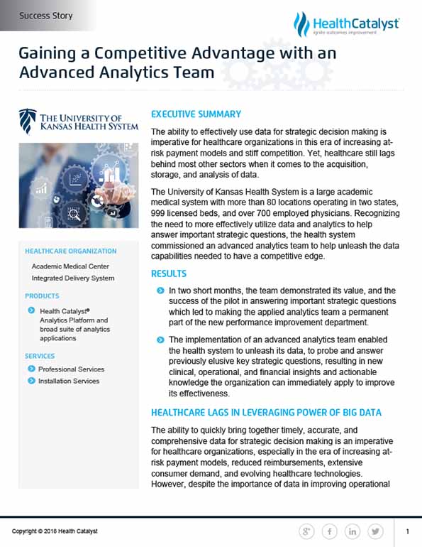 The implementation of an advanced analytics team has enabled The University of Kansas Health System to unleash its data, to probe and answer previously elusive key questions, resulting in clinical, operational, and financial insights, and actionable knowledge that can be applied to address high-priority strategic problems, including: