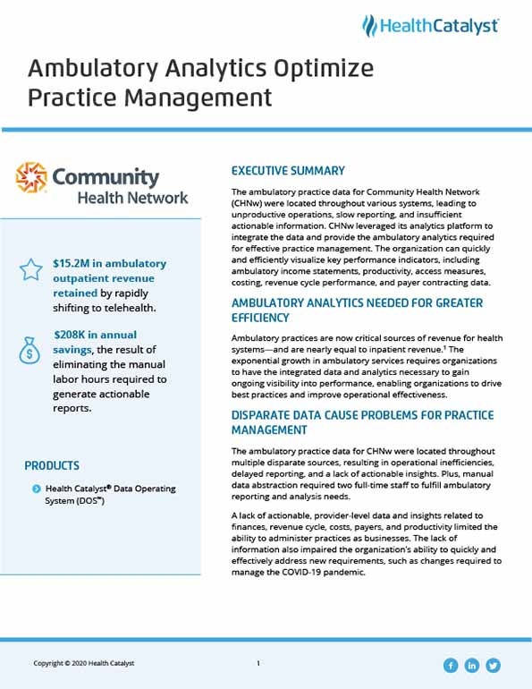 The ambulatory practice data for Community Health Network (CHNw) were located throughout various systems, leading to unproductive operations, slow reporting, and insufficient actionable information. CHNw leveraged its analytics platform to integrate the data and provide the ambulatory analytics required for effective practice management. The organization can quickly and efficiently visualize key performance indicators, including ambulatory income statements, productivity, access measures, costing, revenue cycle performance, and payer contracting data.