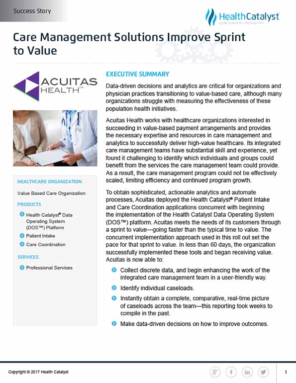 To accelerate the population health management and value-based capabilities of its physician partners, and to effectively and efficiently scale its care management program, Acuitas needed sophisticated analytics that could automate related tasks in real-time, supporting the care management team in proactively engaging patients. Acuitas opted for a fast-track approach, supporting its sprint to value, and quickly deployed two Health Catalyst applications: Patient Intake and Care Coordination concurrent with its implementation of the Health Catalyst Data Operating System (DOS) platform. This approach not only dramatically shortened the time to value, it also provided the opportunity for teams to evaluate the data that currently goes into the EMR, and the rationale behind the data collection, enabling teams to eliminate waste, gain efficiencies, and optimize their workflow.