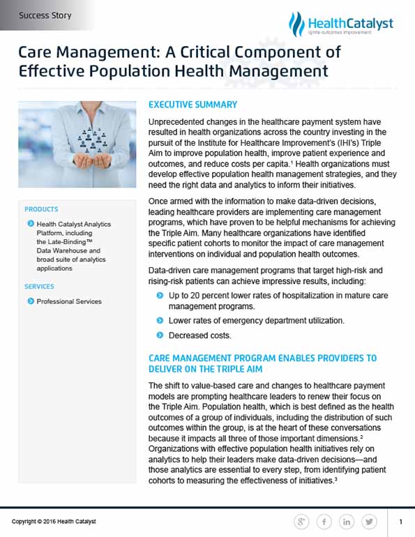 Unprecedented changes in the healthcare payment system have resulted in health organizations across the country investing in the pursuit of the Institute for Healthcare Improvement’s (IHI’s) Triple Aim to improve population health, improve patient experience and outcomes, and reduce costs per capita.1 Health organizations must develop effective population health management strategies, and they need the right data and analytics to inform their initiatives.