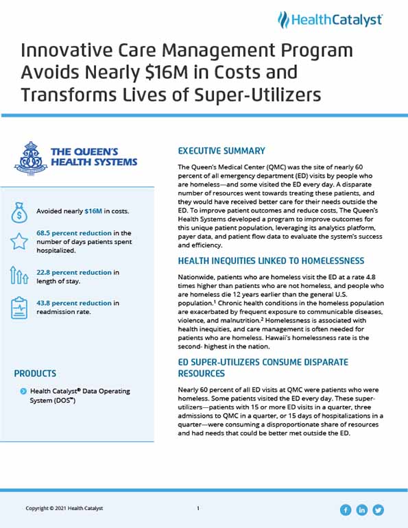The Queen’s Medical Center (QMC) was the site of nearly 60 percent of all emergency department (ED) visits by people who are homeless—and some visited the ED every day. A disparate number of resources went towards treating these patients, and they would have received better care for their needs outside the ED. To improve patient outcomes and reduce costs, The Queen’s Health Systems developed a program to improve outcomes for this unique patient population, leveraging its analytics platform, payer data, and patient flow data to evaluate the system’s success and efficiency.