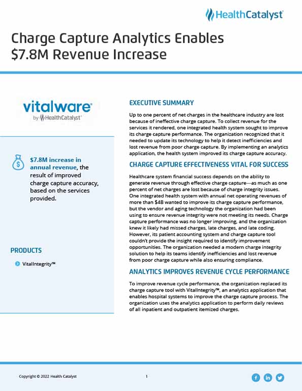 Up to one percent of net charges in the healthcare industry are lost because of ineffective charge capture. To collect revenue for the services it rendered, this integrated health system sought to improve its charge capture performance. The organization recognized that it needed to update its technology to help it detect inefficiencies and lost revenue from poor charge capture. By implementing VitalIntegrity™, the health system improved its charge capture accuracy.
