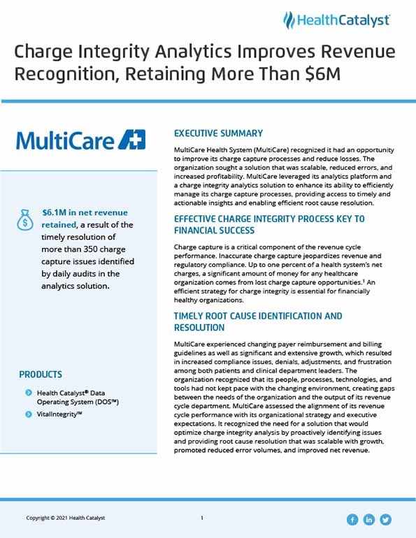 "MultiCare Health System leveraged Health Catalyst’s DOS platform and VitalIntegrity solution to efficiently identify and resolve charge capture issues, retaining $6.1M in net revenue in just three months, while supporting root cause analyses for ongoing process improvement."