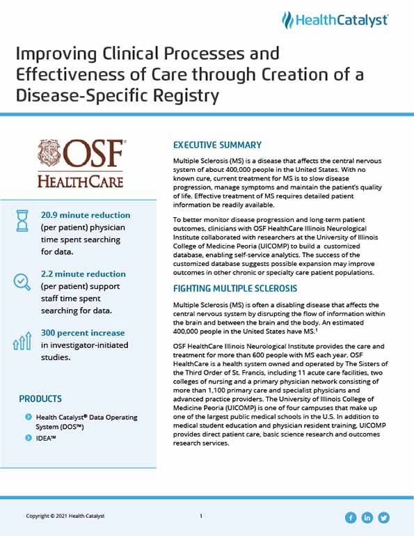 Given the success of the MS flowsheet registry, OSF is evaluating the possible expansion of disease-specific registries integrated with the data in the analytics platform to further improve outcomes in other chronic patient populations.