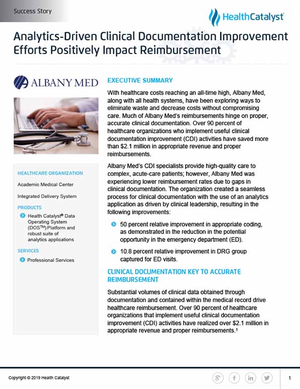 As a data-driven organization, Albany Med leveraged the Health Catalyst® Data Operating System (DOS™) and a robust suite of analytics applications. The data and analytics platform extracts data from multiple source systems and gathers them into an easily consumable visualization. Leveraging data within the analytics platform, Albany Med implemented a clinical documentation analytics accelerator to gain insight into the data it needed to ensure accurate coding and reimbursement.