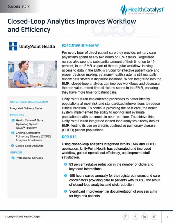 UnityPoint Health implemented processes to better identify populations at most risk and standardized interventions to reduce clinical variation. To continue providing the best care, the health system implemented the ability to monitor and evaluate population health outcomes in near real-time. To achieve this, UnityPoint Health integrated closed-loop analytics directly into its EMR, testing its use on chronic obstructive pulmonary disease (COPD) patient populations.