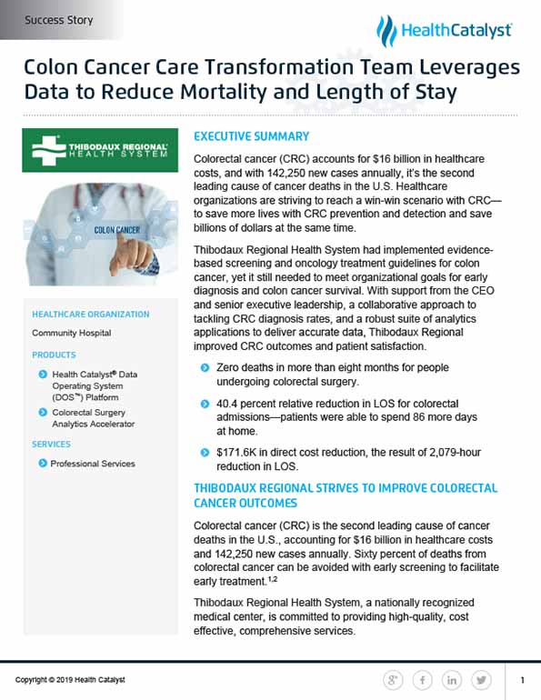 Thibodaux Regional utilized the Health Catalyst® Data Operating System (DOS™) and a robust suite of analytics applications, including the Colorectal Surgery Analytics Accelerator, to monitor and analyze CRC screening and care, identifying specific opportunities to improve CRC clinical outcomes and reduce CRC care costs.