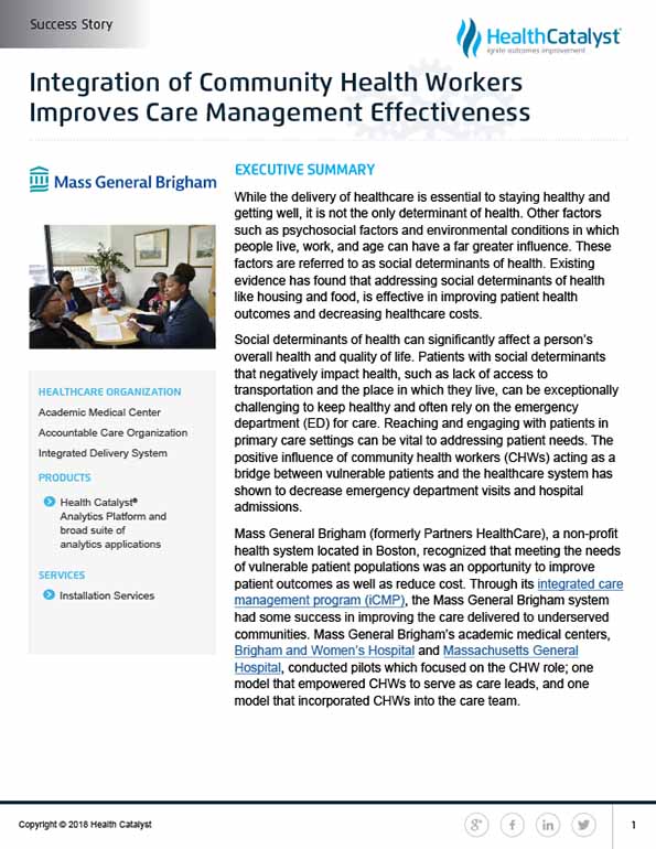 The positive impacts of community health workers (CHWs) have been well documented, yet in general, CHWs remain underutilized and have not been fully integrated into care teams. Read how Mass General Brigham (formerly Partners HealthCare) successfully integrated CHWs into its integrated care management program (iCMP) care team to improve patient outcomes and reduce cost.