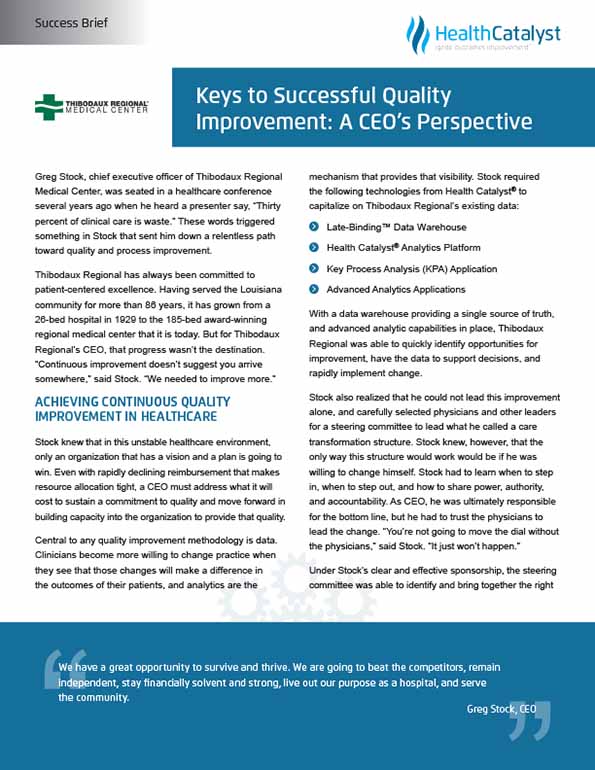 Central to any quality improvement methodology is data. Clinicians become more willing to change practice when they see that those changes will make a difference in the outcomes of their patients, and analytics are the mechanism that provides that visibility. Stock required the following technologies from Health Catalyst to capitalize on Thibodaux Regional’s existing data: