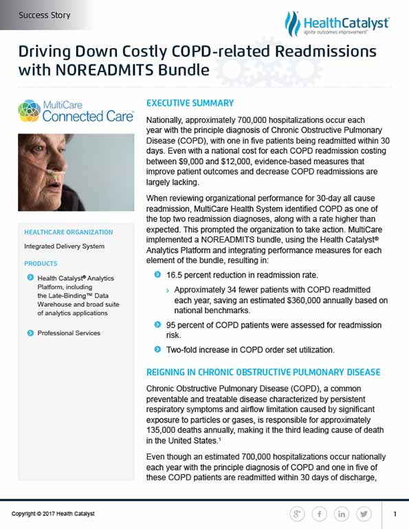Each year, around 700,000 hospitalizations for Chronic Obstructive Pulmonary Disease (COPD) occur in the U.S., with 20 percent of patients readmitted within 30 days. To address higher-than-expected readmission rates, MultiCare Health System implemented a NOREADMITS bundle, utilizing its analytics platform to enhance patient outcomes and reduce the rates of COPD readmissions.