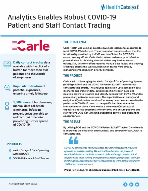 Carle Health is leveraging the Health Catalyst® Data Operating System (DOS™) platform and the COVID-19 Patient & Staff Tracker for its contact tracing efforts. The analytics application uses admission data, discharge and transfer data, patient-specific infection data, and isolation orders to visualize and identify patients with COVID-19 and to pinpoint any potential exposures. The organization can quickly and easily identify all patients and staff who may have been exposed to the patient with COVID-19 down to the specific bed level where the interaction took place. Carle Health is able to notify contacts of exposure, address questions and concerns, and ensure patients and staff receive SARS-CoV-2 testing, supportive service, and quarantine as appropriate.