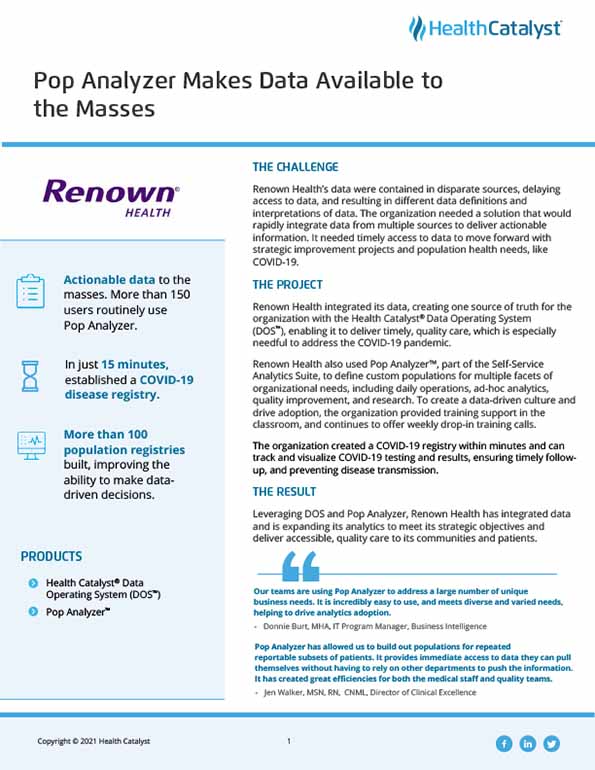 Renown Health’s data were contained in disparate sources, delaying access to data, and resulting in different data definitions and interpretations of data. Renown Health integrated its data, creating one source of truth for the organization with the Health Catalyst® Data Operating System (DOS™), enabling it to deliver timely, quality care, which is especially needful to address the COVID-19 pandemic.