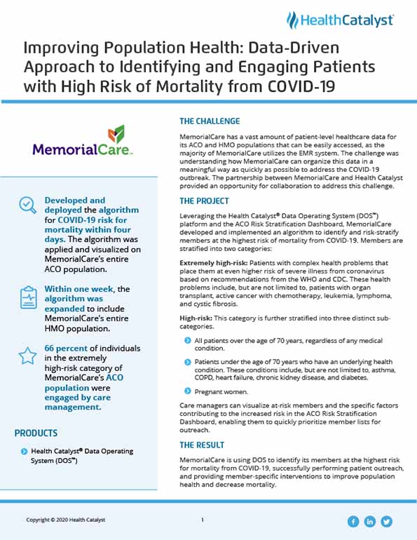 Leveraging the Health Catalyst® Data Operating System (DOS™) platform and the ACO Risk Stratification Dashboard, MemorialCare developed and implemented an algorithm to identify and risk-stratify members at the highest risk of mortality from COVID-19. Care managers can visualize at-risk members and the specific factors contributing to the increased risk, allowing them to quickly prioritize member lists for outreach—improving population health and decreasing mortality.