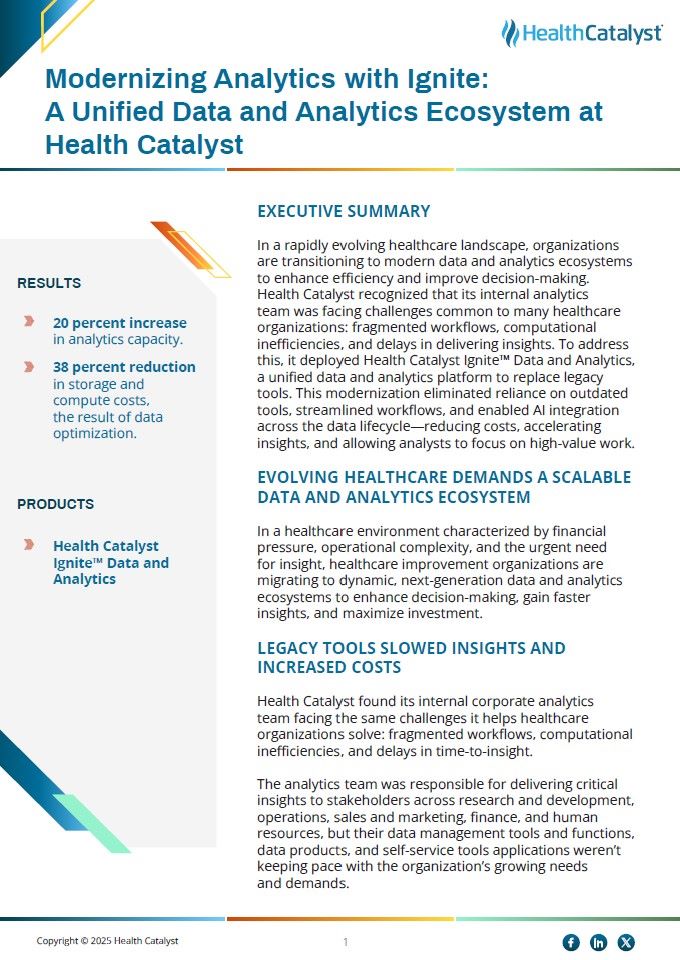 In a rapidly evolving healthcare landscape, organizations are transitioning to modern data and analytics ecosystems to enhance efficiency and improve decision-making. Health Catalyst recognized that its internal analytics team was facing challenges common to many healthcare organizations: fragmented workflows, computational inefficiencies, and delays in delivering insights. To address this, it deployed Health Catalyst Ignite™ Data and Analytics, a unified data and analytics platform to replace legacy tools. This modernization eliminated reliance on outdated tools, streamlined workflows, and enabled AI integration across the data lifecycle—reducing costs, accelerating insights, and allowing analysts to focus on high-value work.