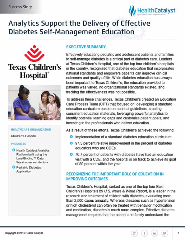 Effectively educating pediatric and adolescent patients and families to self-manage diabetes is a critical part of diabetes care. Leaders at Texas Children’s Hospital, one of the top four children’s hospitals in the country, recognized that diabetes education that incorporates national standards and empowers patients can improve clinical outcomes and quality of life. While diabetes education has always been important to Texas Children’s, the education provided to patients was varied, no organizational standards existed, and tracking the effectiveness was not possible.
