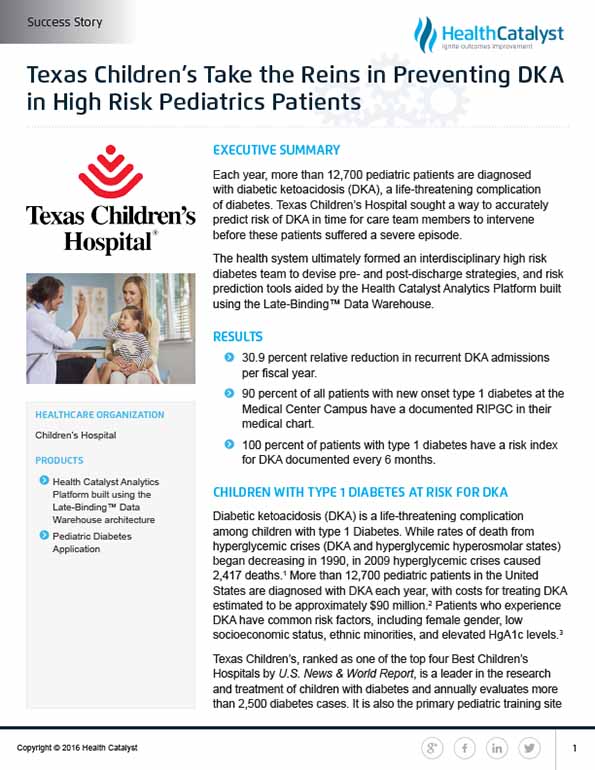 To better serve its pediatric patients, Texas Children's Hospital created a multidisciplinary high-risk diabetes team to develop strategies for predicting and preventing diabetic ketoacidosis (DKA) episodes. The organization utilized risk prediction tools powered by the Health Catalyst Analytics Platform and a Late-Binding™ Data Warehouse to support the team's efforts.