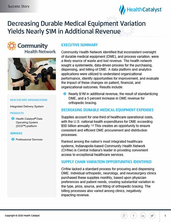 Community Health Network identified that inconsistent oversight of durable medical equipment (DME), and process variation, were a likely source of waste and lost revenue. The health network sought a systemwide, data-driven process for the purchasing, dispensing, and billing of DME. A data platform and analytics applications were utilized to understand organizational performance, identify opportunities for improvement, and evaluate the impact of these changes on patient, financial, and organizational outcomes.