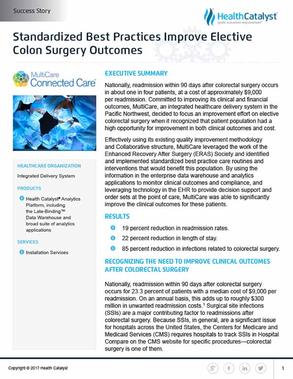 Committed to improving its clinical and financial outcomes, MultiCare focused on improving outcomes for elective colorectal surgery due to high readmission rates and costs. By implementing standardized best practices from the ERAS Society and using data analytics for monitoring, the organization enhanced clinical outcomes and reduced costs for this patient population.