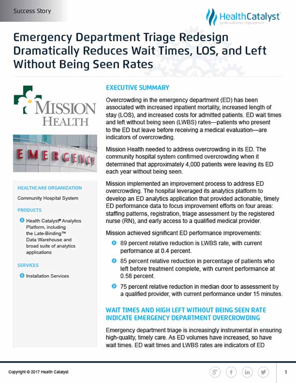 Mission Health sought to address overcrowding in its emergency department, where 4,000 patients were leaving its ED each year without being seen. By implementing an improvement process using an analytics platform, the hospital focused on staffing, registration, triage, and early provider access, leading to significant enhancements in ED performance and patient care.