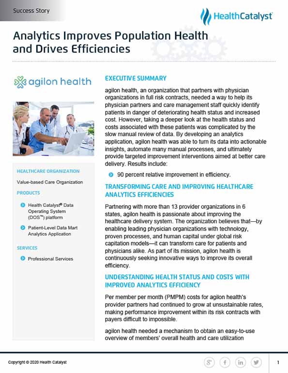 agilon health, an organization that partners with physician organizations in full risk contracts, needed a way to help its physician partners and care management staff quickly identify patients in danger of deteriorating health status and increased cost. However, taking a deeper look at the health status and costs associated with these patients was complicated by the slow manual review of data. By developing an analytics application, agilon health was able to turn its data into actionable insights, automate many manual processes, and ultimately provide targeted improvement interventions aimed at better care delivery.