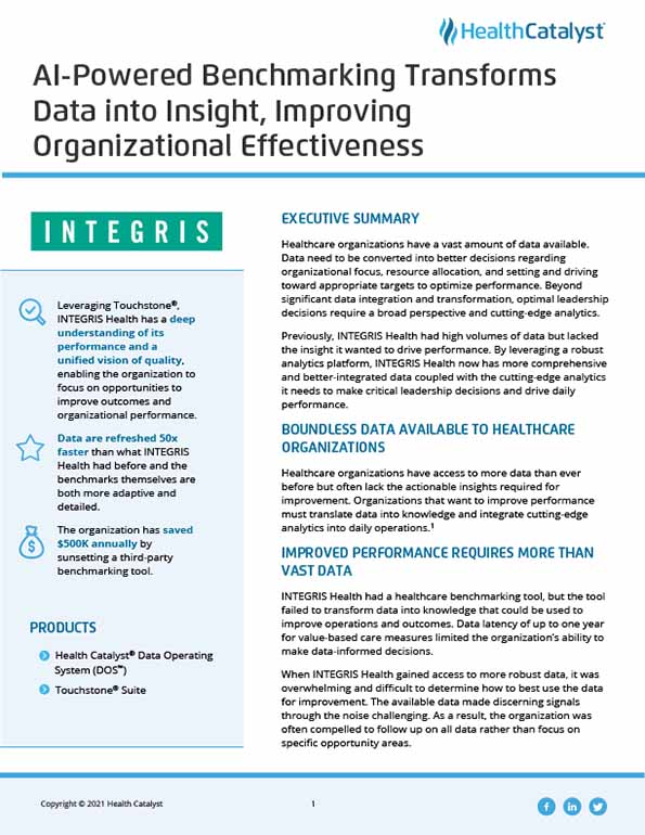 INTEGRIS Health leveraged the Health Catalyst® Data Operating System (DOS™) platform and a robust suite of analytics applications, including Touchstone® Suite and Healthcare.AI™, to establish a single source of truth across its disparate systems and gain powerful insight into performance. Touchstone is a benchmarking asset that uses artificial intelligence to proactively identify where an organization is performing well and where it is underperforming so that organizations can prioritize and drive towards improvement.