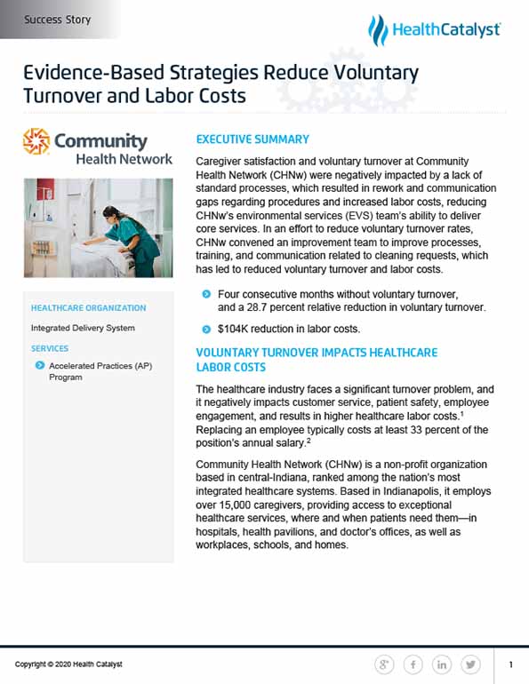 Caregiver satisfaction and voluntary turnover at Community Health Network (CHNw) were negatively impacted by a lack of standard processes, which resulted in rework and communication gaps regarding procedures and increased labor costs, reducing CHNw’s environmental services (EVS) team’s ability to deliver core services. In an effort to reduce voluntary turnover rates, CHNw convened an improvement team to improve processes, training, and communication related to cleaning requests, which has led to reduced voluntary turnover and labor costs.