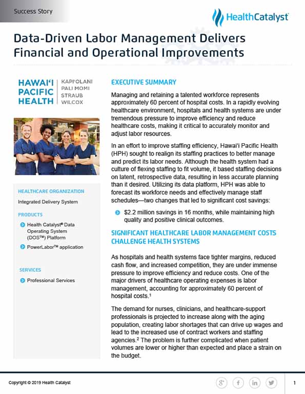 To gain insight into its performance, HPH partnered with Health Catalyst to conduct an opportunity analysis. The data uncovered opportunities to reduce costs in healthcare labor management and identified the top ten areas across four hospitals with the biggest potential to improve. To tackle the challenge, HPH leveraged the Health Catalyst® Data Operating System (DOS™) and a robust set of analytics applications—including PowerLabor™, an analytics application that helps managers facilitate more efficient labor force utilization by understanding basic operation and staffing indicators.