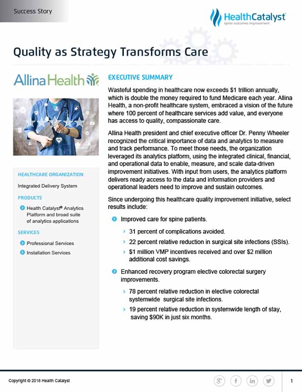 Allina Health president and chief executive officer Dr. Penny Wheeler recognized the critical importance of data and analytics to measure and track performance. To meet those needs, the organization leveraged its analytics platform, using the integrated clinical, financial, and operational data to enable, measure, and scale data-driven improvement initiatives. With input from users, the analytics platform delivers ready access to the data and information providers and operational leaders need to improve and sustain outcomes.